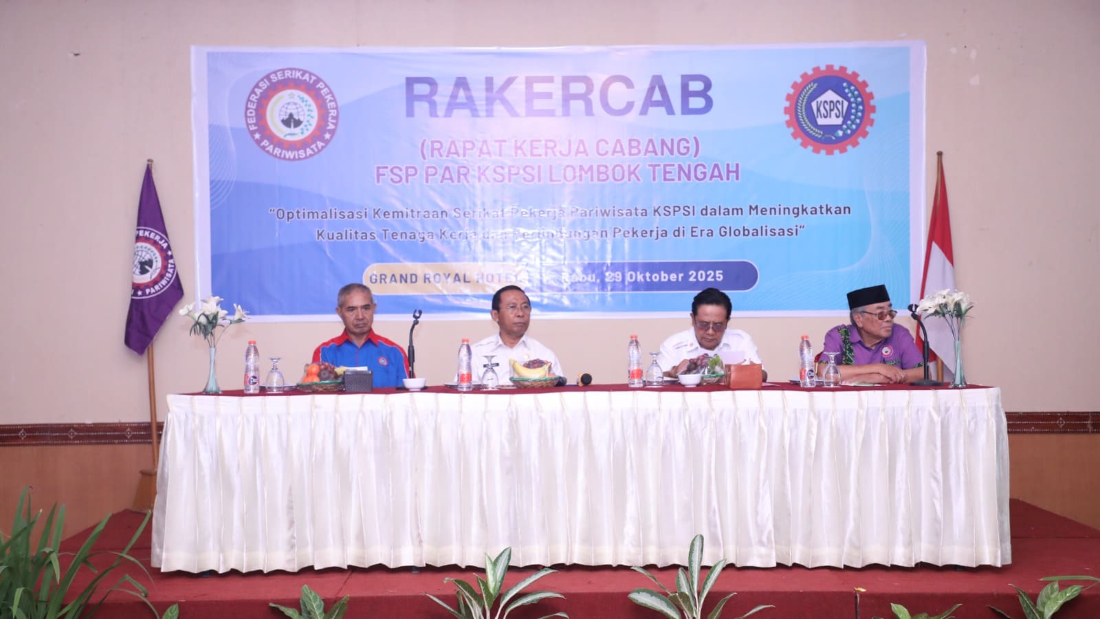 PRAYA – Federasi Serikat Pekerja Pariwisata (FSP PAR) SPSI Kabupaten Lombok Tengah menggelar Rapat Kerja Cabang (RAKERCAB) Ke-II Tahun 2025 di Ballroom Grand Royal Praya, Lombok Tengah, dengan mengusung tema “Optimalisasi Kemitraan Serikat Pekerja Pariwisata KSPSI dalam Meningkatkan Kualitas Tenaga Kerja dan Perlindungan Pekerja di Era Globalisasi.”