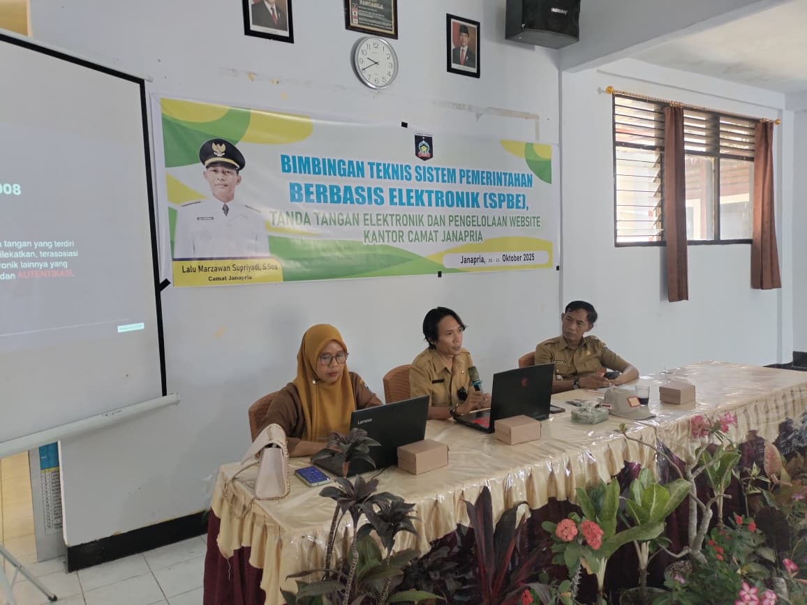 Lombok Tengah — Pemerintah Kecamatan Janapria menyelenggarakan Sosialisasi dan Bimbingan Teknis (Bimtek) Tanda Tangan Elektronik (TTE) pada Senin, 20 Oktober 2025, bertempat di Kantor Camat Janapria.